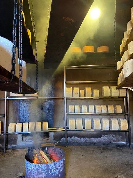 The cheese is crafted using raw milk from cows, goats, and sheep, and is naturally smoked with oak and chestnut wood, which contributes to its distinctive flavor. The maturation process takes place in natural caves, where the action of fungi adds to the cheese's complexity.